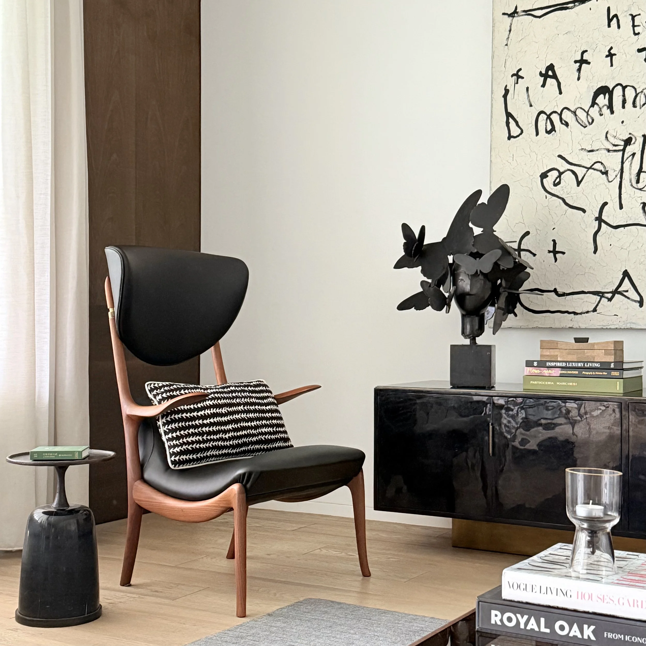 A new layout introduces clarity and balance, allowing each piece to sit with intention. Sculptural furniture forms and curated objects are set against a backdrop of rich timber, dark lacquer and soft neutrals, creating a composed interplay of weight, texture and tone.