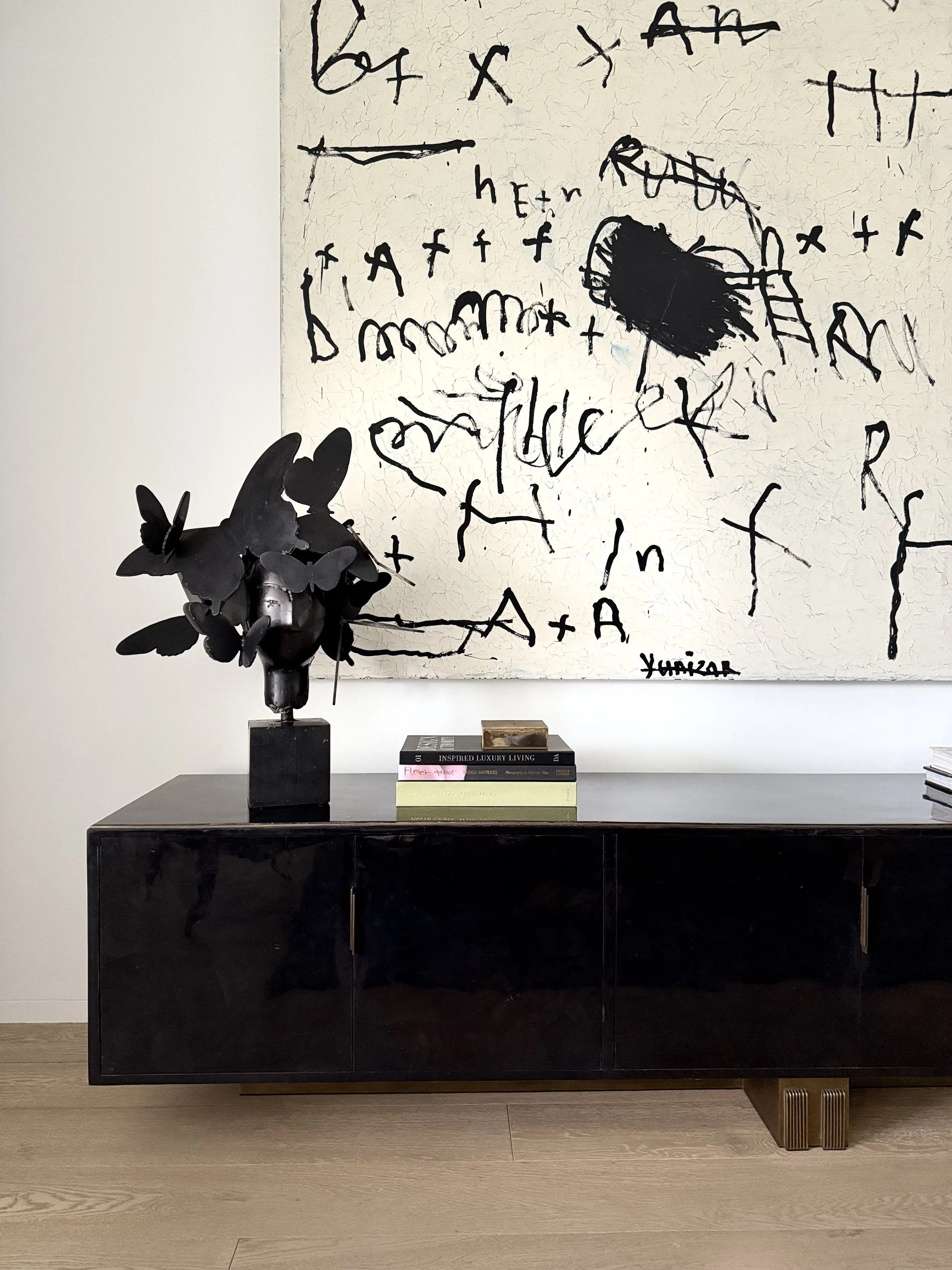 The client’s art collection plays a central role in shaping the atmosphere of the space. Bold, expressive works are given prominence, bringing contrast, personality and a sense of individuality to the otherwise restrained interiors. Each piece is carefully positioned to anchor key views and add moments of visual interest throughout.