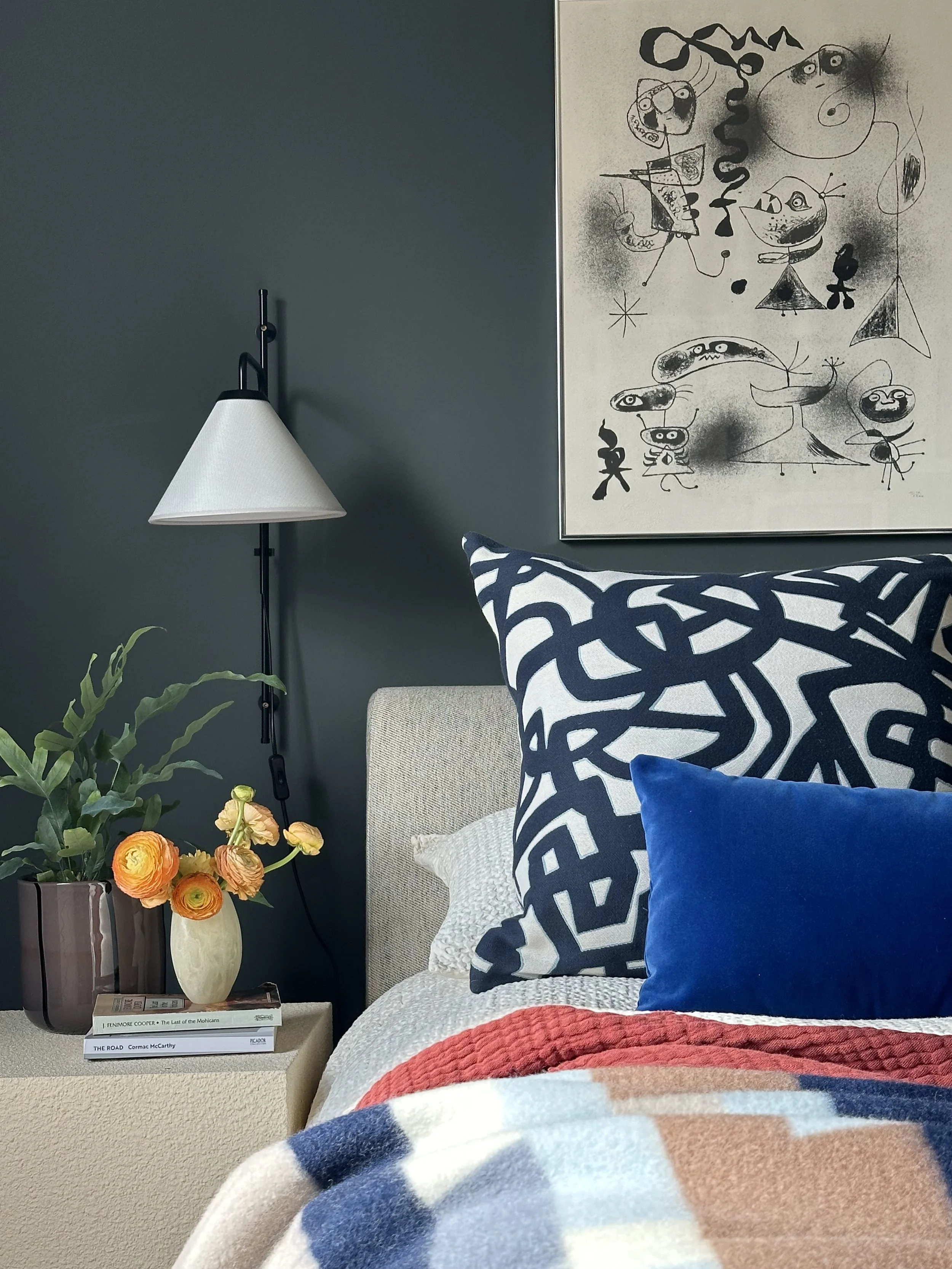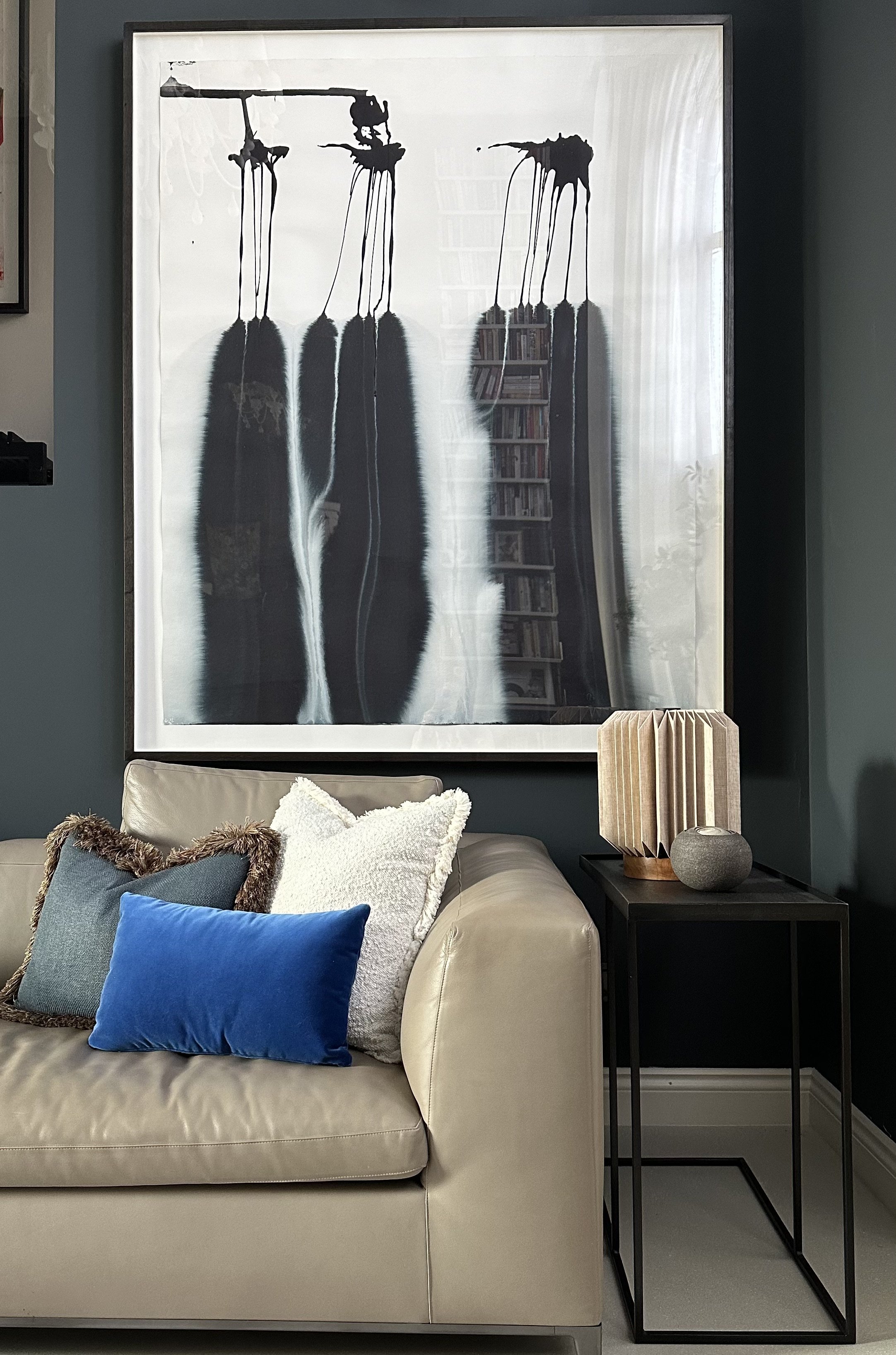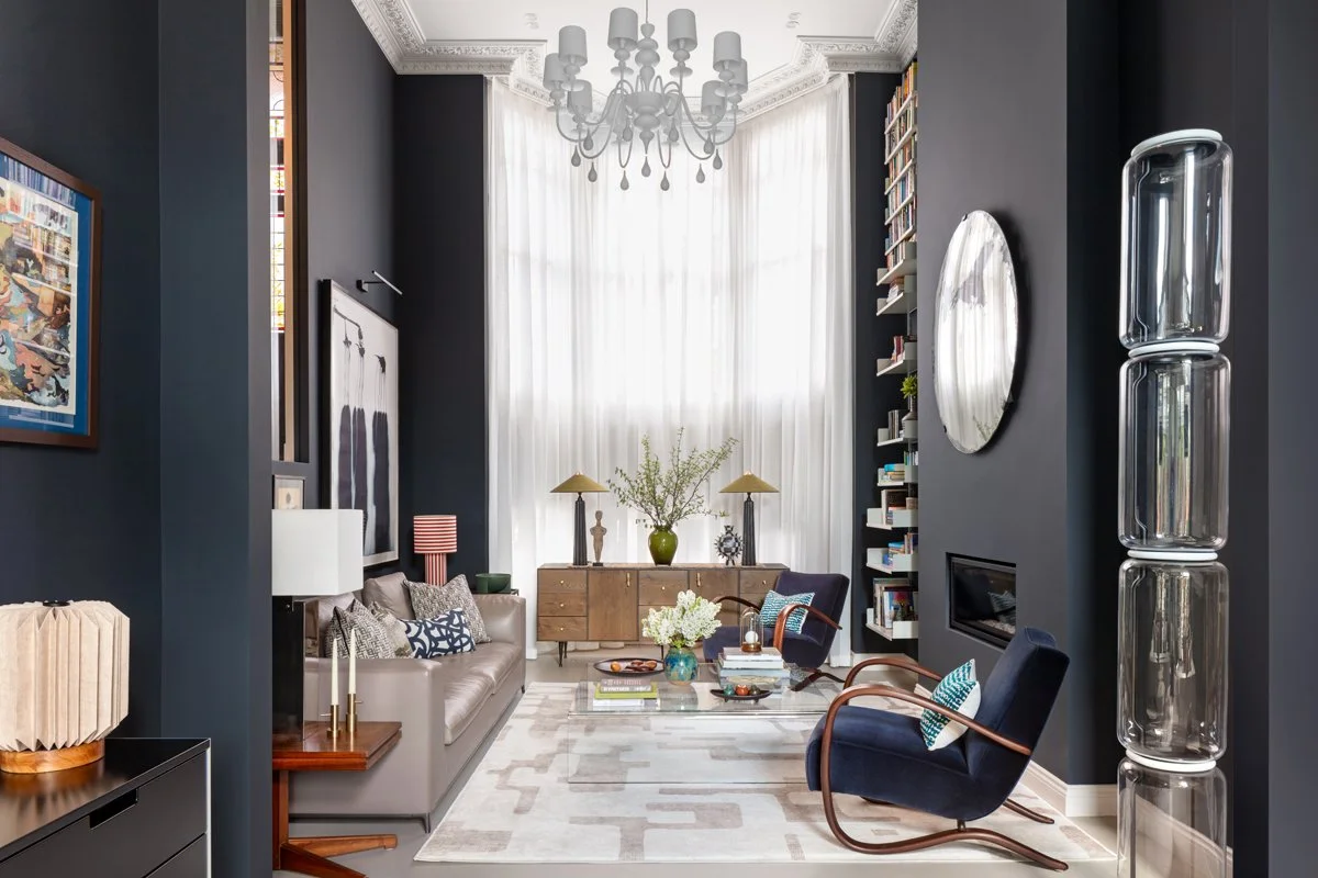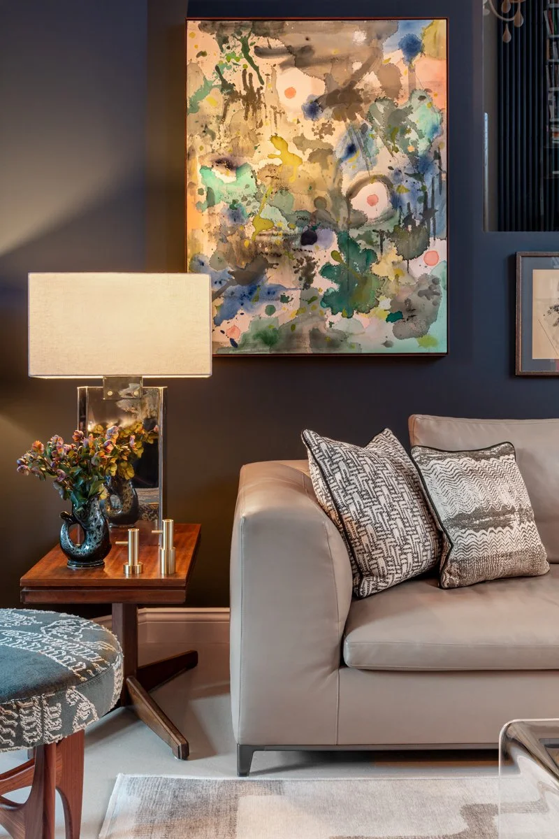 Artwork plays an integral role throughout, bringing contrast and personality to the interiors. Bold, graphic pieces are set against deeper tones, while a mix of contemporary furniture, vintage elements and layered textiles softens the architecture and adds warmth. A considered palette of blues, reds and earthy tones runs throughout, creating cohesion while allowing each space to retain its own identity.