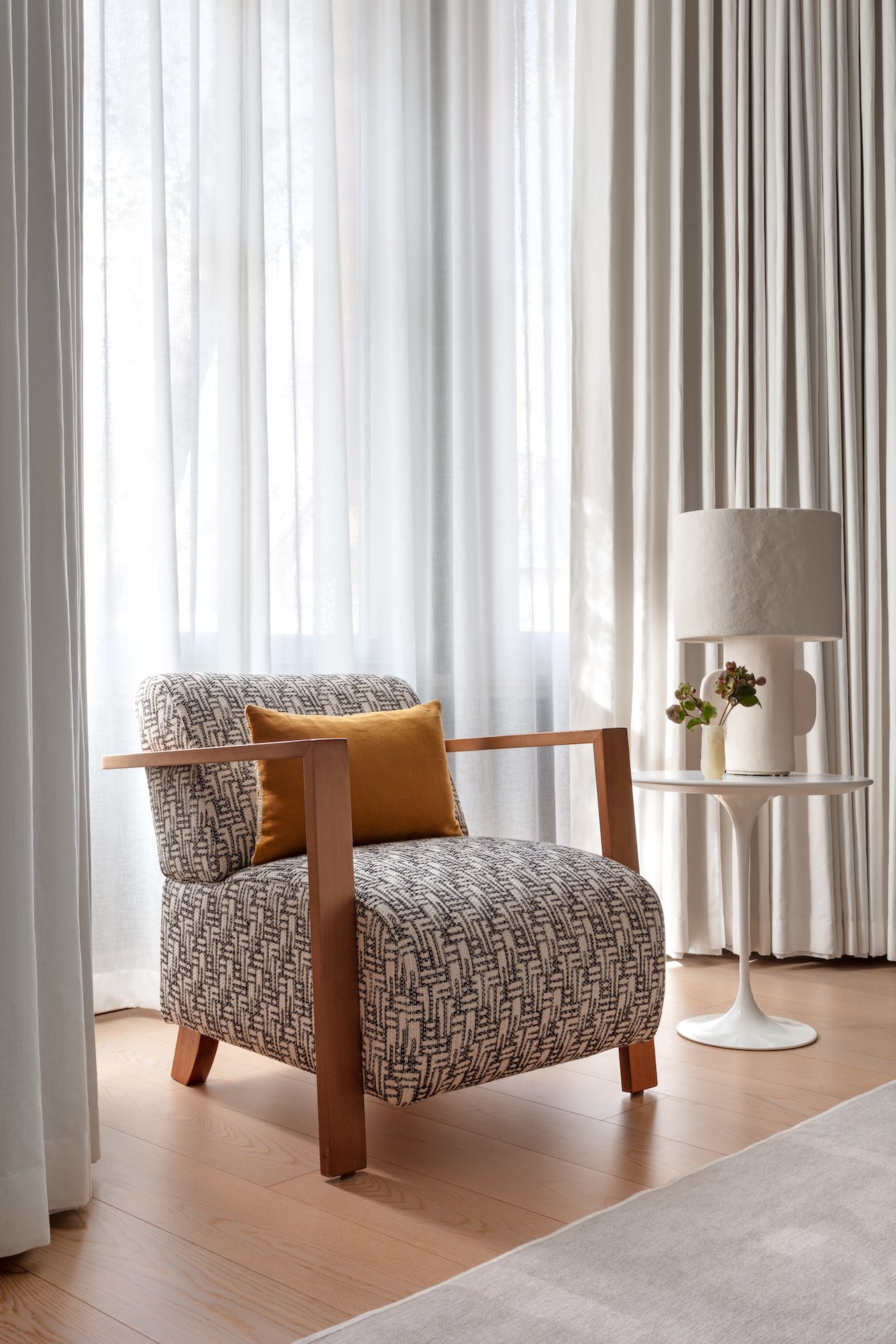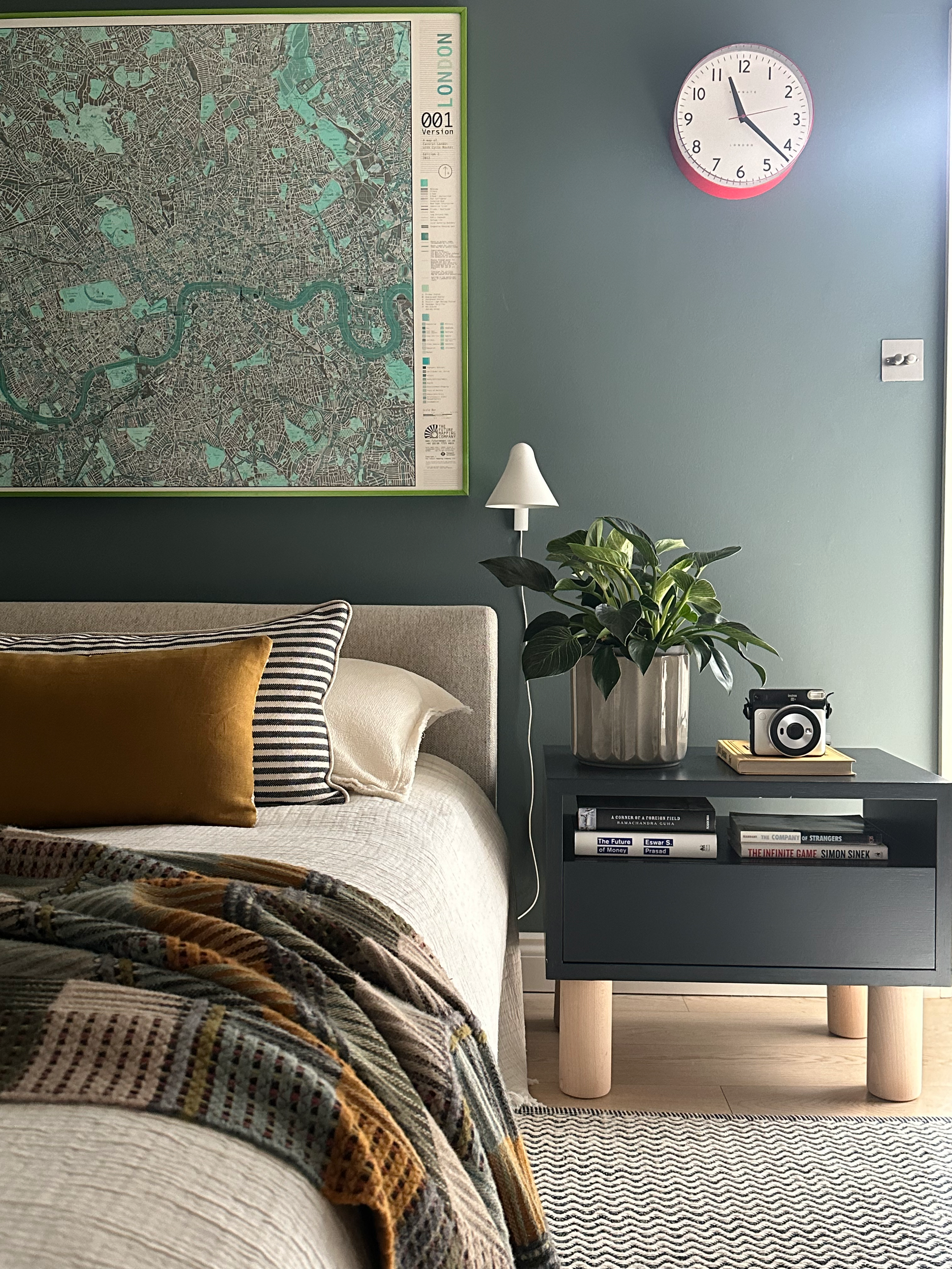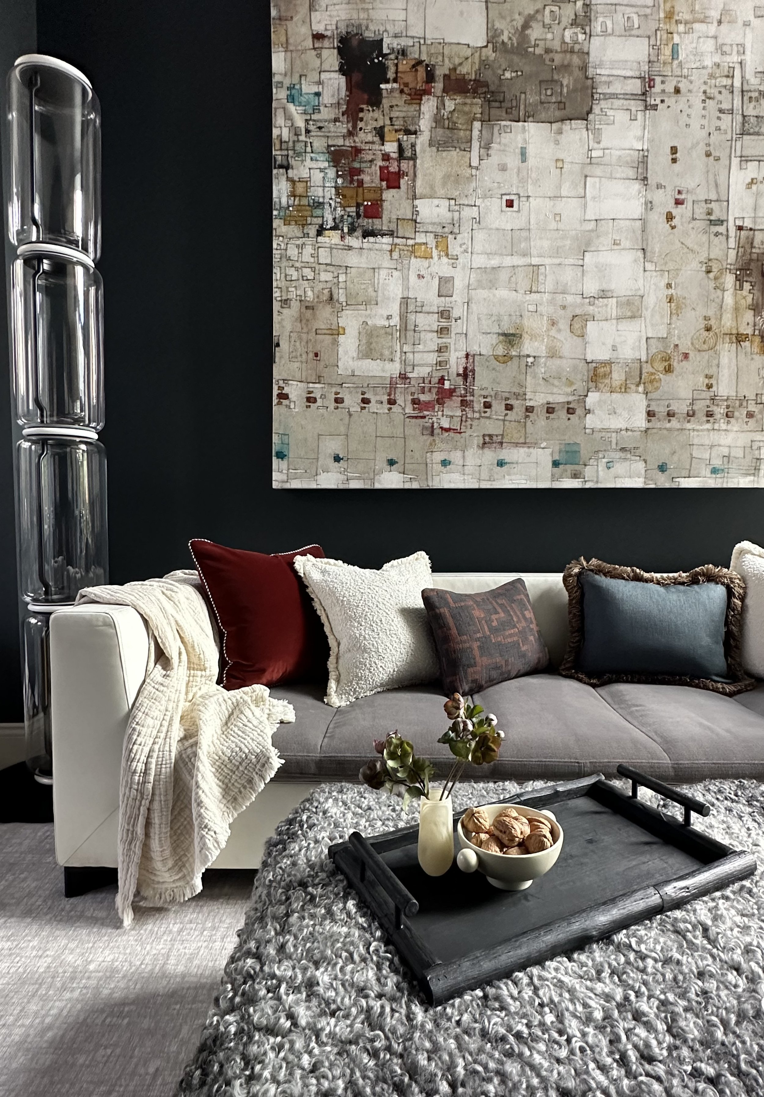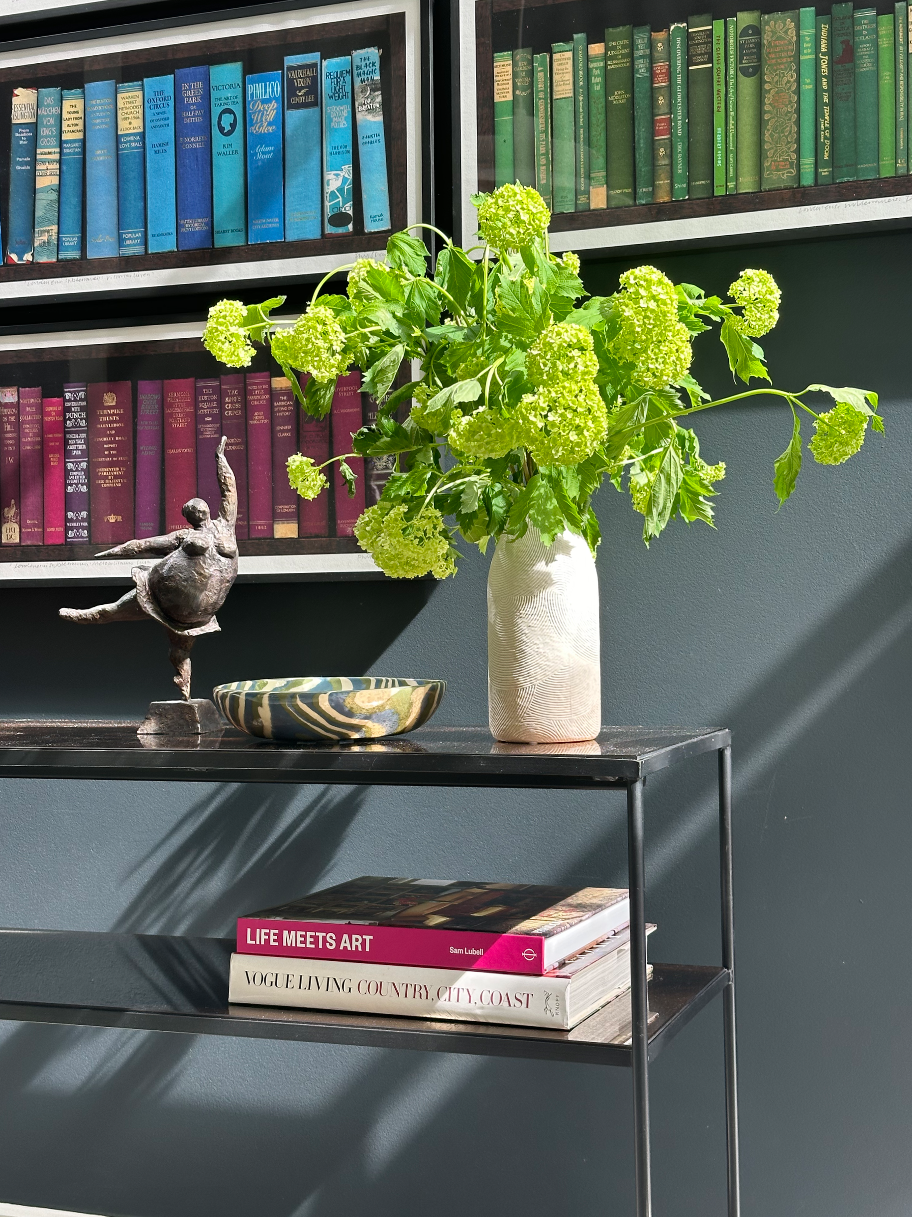 Artwork plays an integral role throughout, bringing contrast and personality to the interiors. Bold, graphic pieces are set against deeper tones, while a mix of contemporary furniture, vintage elements and layered textiles softens the architecture and adds warmth. A considered palette of blues, reds and earthy tones runs throughout, creating cohesion while allowing each space to retain its own identity.
